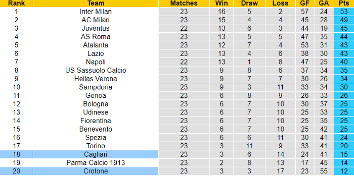 Do Serie A 2020/21 còn tới 15 vòng đấu nữa nên Cagliari vẫn còn nhiều cơ hội để trụ hạng. Có điều, họ phải sớm thu về những kết quả tích cực để làm ‘bàn đạp’ cho sự trở lại. Bằng không, CLB này sẽ phải xuống chơi tại Serie B mùa tới.