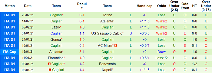 - Thống kê 10 trận gần nhất của Cagliari