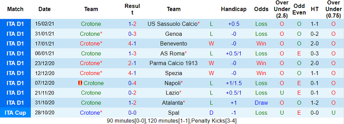 - Thống kê 10 trận gần nhất của Crotone