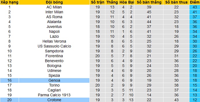 Trong khi đó Genoa cũng chỉ đang đứng ở vị trí thứ 16 trên bảng xếp hạng với 18 điểm cũng sau 19 vòng đấu. Tuy chỉ đứng trên nhóm cầm đèn đỏ có 2 bậc nhưng Genoa vẫn hơn tới 4 điểm.