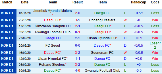 + Thống kê 10 trận gần nhất của Daegu