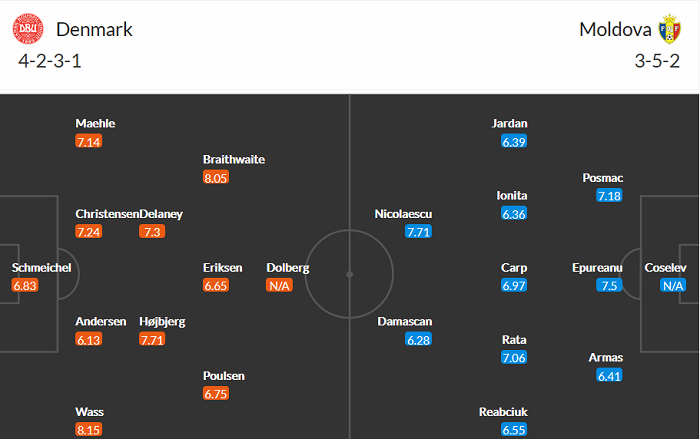 Đội hình dự kiến Đan Mạch vs Moldova