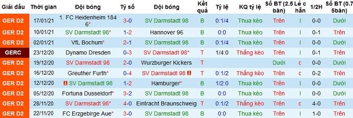 + Thống kê 10 trận gần nhất của Darmstadt