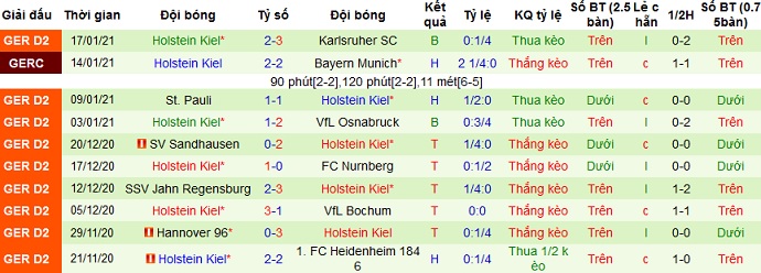 Tuy nhiên phong độ gần đây của Holstein Kiel không thật tốt khi chỉ có được 2 trận thắng, 1 trận hòa và 2 trận thua ở 5 trận gần đây. Thế nhưng thành tích sân khách của Holstein Kiel lại rất tốt khi đang bất bại trong cả 8 trận gần nhất với 5 trận thắng và 3 trận hòa.