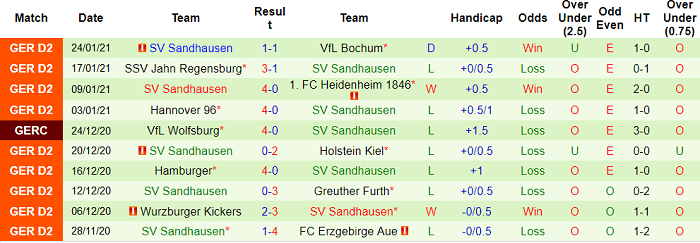 - Thống kê 10 trận gần nhất của Sandhausen