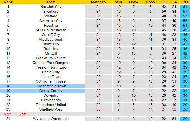 7 vòng đấu vừa qua tại giải hạng nhất Anh, Derby County giành chiến thắng 5 trận cả về tỷ số và kèo châu Á. Từ vị trí thứ 24 trên bảng xếp hạng, Derby County đã vươn lên xếp thứ 19 với 34 điểm sau 30 trận. Trong khi đó Huddersfield có 36 điểm sau 31 trận và liên tục gây thất vọng ở các chuyến làm khách. 10 trận xa nhà gần đây Huddersfield bất thắng với 7 thất bại và 3 trận hoà.