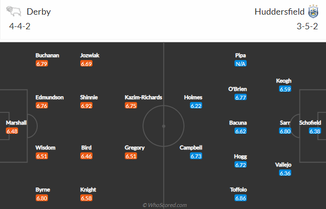 Khi đối đầu Huddersfield trên sân nhà, Derby County luôn có được thành tích khả quan. Cụ thể, 6 lần trước đây làm khách tại Derby County, Huddersfield bất thắng với 4 thất bại và 2 trận hoà. Lần tái đấu sắp tới, Bầy cừu tiếp tục hứa hẹn vào khả năng giành 3 điểm tối đa sau những màn trình diễn ấn tượng giai đoạn gần đây.