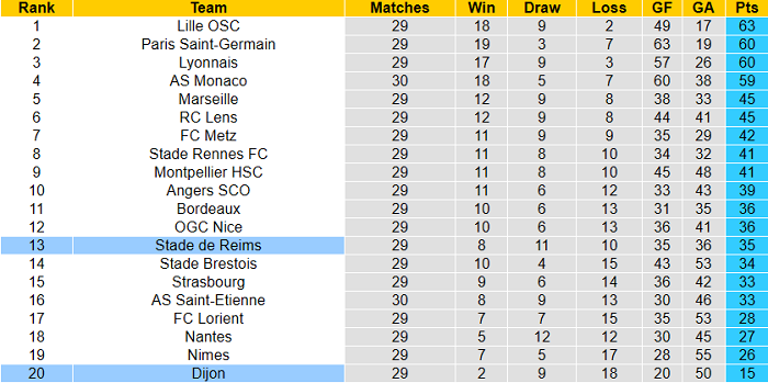 Nhưng chạm trán Reims là cơ hội để Dijon cắt đứt chuỗi toàn thua. Reims đơn giản tỏ ra ‘thích’ các kết quả hòa trong thời gian vừa qua. Thật vậy, Reims đã hòa tới 5/7 vòng gần nhất.