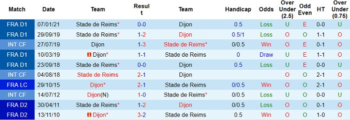 Mà những trận đấu gần đây giữa Dijon và Reims cũng thường xuyên xuất hiện các kết quả hòa. Cụ thể: họ chia điểm với nhau tới 3/4 lần so tài gần nhất thuộc khuôn khổ Ligue 1. Ở trận lượt đi mùa này, hai đội cũng hòa không bàn thắng trên sân của Reims.