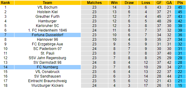Ở 5 vòng gần nhất thì Dusseldorf thua đến 3 trận, đó chắc chắn không thể là thành tích của 1 ứng viên lên hạng. Trong khi ấy, Nurnberg còn bết bát hơn với vị trí thứ 14. Dẫu sao thì Nurnberg cũng có chút khởi sắc, và họ tạo ra cách biệt 6 điểm so với vị trí cầm đèn đỏ gần nhất.