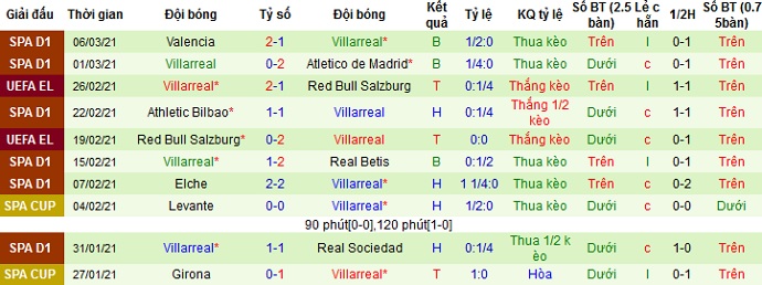 + Thống kê 10 trận gần nhất của Villarreal