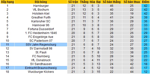 Trong khi đó Jahn Regensburg đang đứng thứ 11 trên bảng xếp hạng với 26 điểm có được cũng sau 21 vòng đấu. Tuy nhiên đây không phải điều quá bất ngờ khi ở mùa giải trước Jahn Regensburg cũng chỉ cán đích ở vị trị trí thứ 12 của giải đấu.