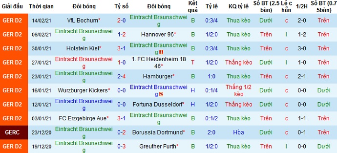 Trong 5 trận gần nhất Braunschweig chỉ có được 1 trận thắng duy nhất, để thua ở cả 4 trận còn lại. Ngay trên sân nhà thành tích của Eintracht Braunschweig cũng không khá hơn bao nhiêu khi ở 5 trận gần nhất tại đây đội bóng chỉ có 1 trận thắng, 1 trận hòa và để thua 3 trận.
