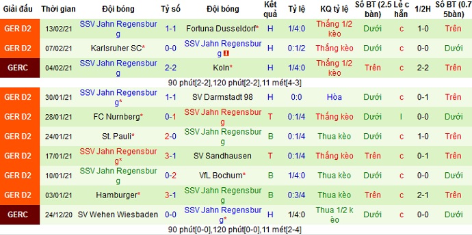 Đáng nói là Jahn Regensburg đang bất bại trong 5 trận gần nhất với 2 trận thắng và 3 trận hòa, bao gồm cả trận thắng trước Koln tại cúp quốc gia. Thành tích sân khách của Jahn Regensburg cũng không tệ với 2 trận thắng, 1 trận hòa và 2 trận thua trong 5 lần du đấu gần đây.