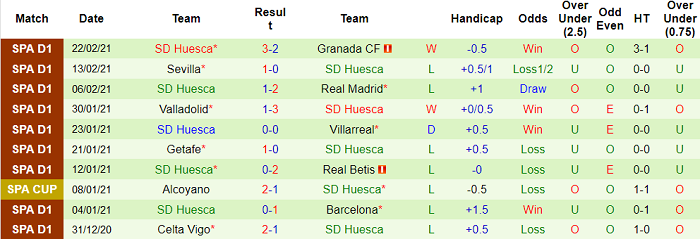 - Thống kê 10 trận gần nhất của Huesca