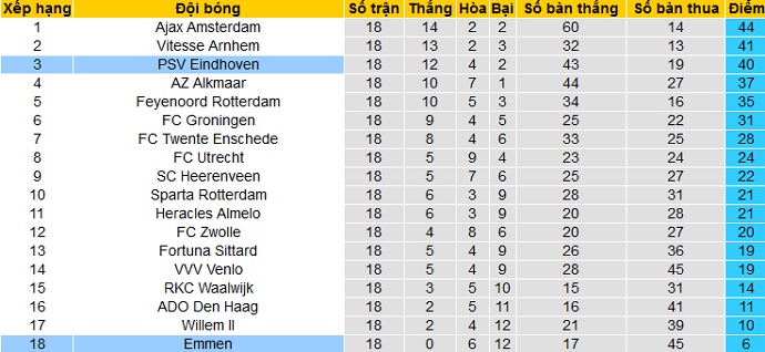 Bảng xếp hạng giải VĐQG Hà Lan trước vòng 19