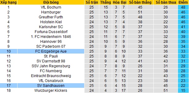Erzgebirge Aue hiện đang đứng giữa bảng xếp hạng của giải hạng nhì Đức ở vị trí thứ 10. Với 33 điểm có được sau 25 vòng đấu, Erzgebirge Aue đang hơn nhóm các đội cầm đèn đỏ tới 10 điểm, khoảng cách được coi là khá an toàn khi giải còn 9 vòng đấu nữa.