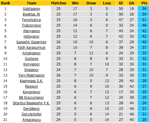 BẢNG XẾP HẠNG VĐQG Thổ Nhĩ Kỳ