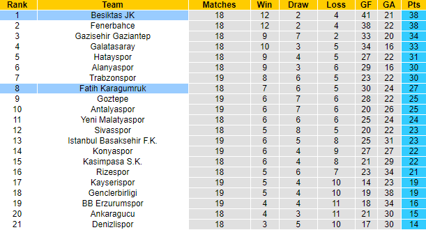Besiktas đang thi đấu vào phom với 8 thắng, 1 hòa trong vòng 9 trận gần đây. Trận đấu sắp tới Besiktas thêm tự tin hướng tới 3 điểm tối đa vì Fatih Karagumruk khủng hoảng lực lượng. Cụ thể, Fatih Karagumruk thiếu vắng tới 7 cẩu thù vì chấn thương và thẻ phạt gồm: Zukanovic, Jorquera, Salibur, Yildirim, Roco, Balkovec và Arveladze.