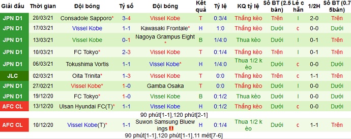 Trong 5 lần đối đầu gần nhất giữa hai đội thành tích cũng cân bằng khi mỗi đội thắng 2, hòa 1 và để thua 2. Ngoài ra Vissel Kobe đang có phong độ bất bại trên sân khách nên có lẽ chọn cửa dưới ở trận đấu này là có cơ sở và hợp lý hơn.