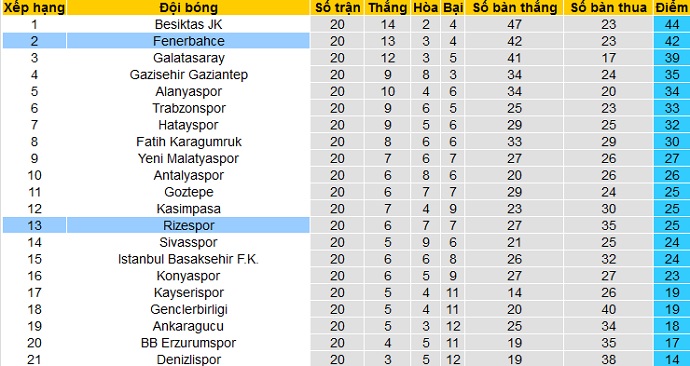Trong khi đó Rizespor chỉ đang đứng thứ 13 trên bảng xếp hạng với 25 điểm cũng sau 20 vòng đấu. Tuy kém các đội trong Top 4 tới 9 điểm nhưng Rizespor cũng có được khoảng cách khá an toàn với nhóm các đội cầm đèn đỏ là 6 điểm.