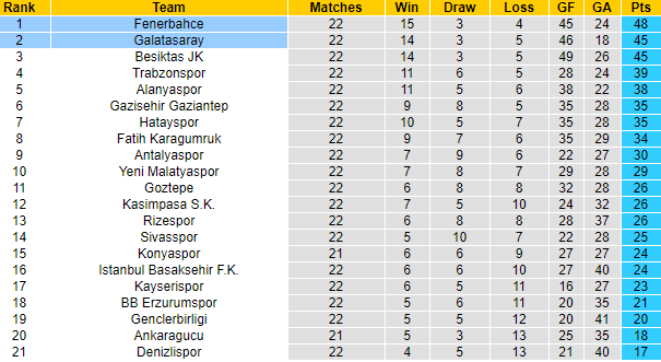 Đấu trường số 1 Thổ Nhĩ Kỳ đã trở về đúng trật tự mà nó vốn có, khi 3 ông lớn Fenerbahce, Galatasaray và Besiktas chiếm 3 vị trí đầu tiên. Cuộc đua vô địch cũng được dự báo là chỉ diễn ra giữa 3 đội bóng này.