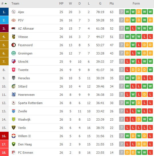 BẢNG XẾP HẠNG GIẢI VĐQG HÀ LAN