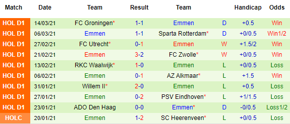 Phía đối diện, Emmen đứng bét bảng và đặt 1 chân lên chuyến tàu xuống hạng. Họ kém vị trí an toàn tới 8 điểm, kém đội được đá play-off chống xuống hạng 7 điểm, con số không dễ san lấp khi trước mắt chỉ còn 8 vòng đấu.