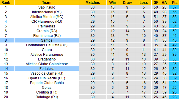 Đá nhiều hơn vị trí xuống hạng 1 trận và chỉ còn hơn đúng 3 điểm, Fortaleza hiểu rằng tình hình hiện tại đã rất nguy cấp và buộc phải tự cứu lấy mình trước khi quá muộn. Nhiệm vụ ít nhất có điểm trước đối thủ khó như Santos vì thế được coi như bắt buộc.