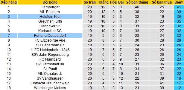 Trận thua khá bất ngờ của Fortuna Düsseldorf trước đội đang đứng bét bảng Würzburger Kickers ở vòng đấu vừa qua đã đẩy Fortuna Düsseldorf tụt xuống vị trí thứ 7 tại giải hạng nhì Đức. Với 32 điểm có được sau 18 vòng đấu, Fortuna Düsseldorf đang kém các đội Top 3 tới 6 điểm.