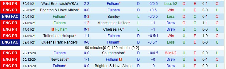 + Thống kê 10 trận gần nhất của Fulham