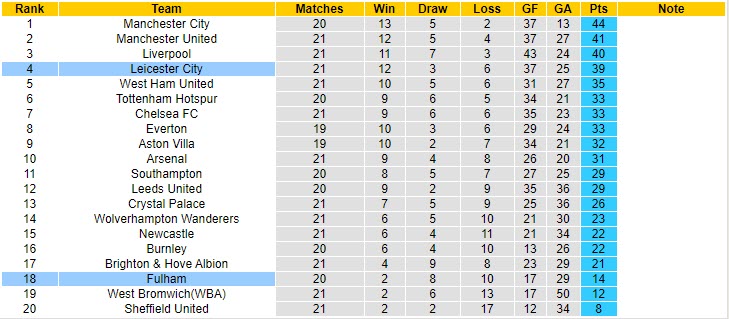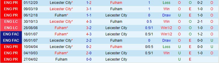 Phong độ và thống kê đối đầu Fulham - Leicester gần đây: