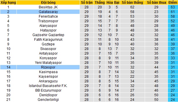 Bảng xếp hạng giải VĐQG Thổ Nhĩ Kỳ trước vòng 30