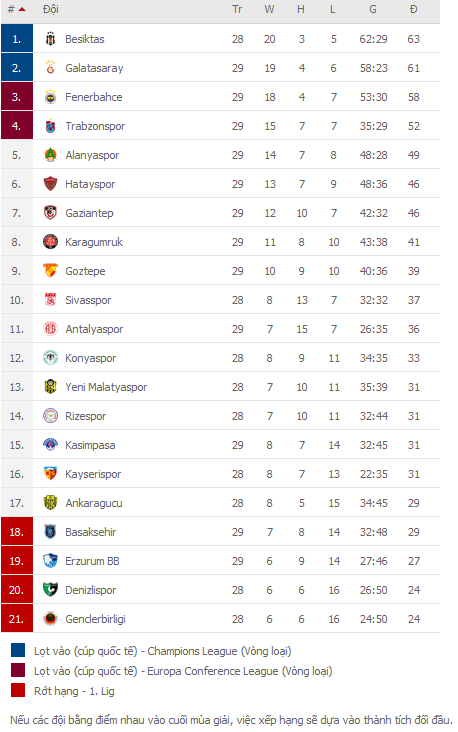 BẢNG XẾP HẠNG VĐQG Thổ Nhĩ Kỳ