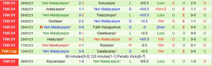 + Thống kê 10 trận gần nhất của Yeni Malatyaspor
