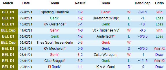 + Thống kê 10 trận gần nhất của Genk