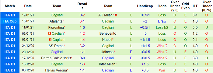 Cagliari không có được thành tích tốt trong thời gian vừa qua. Họ không thắng cả 11 vòng gần đây. 5 vòng gần nhất, Cagliari thậm chí không thu về điểm nào và nhận tổng cộng 12 bàn thua.