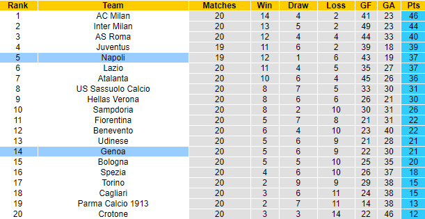 Napoli đang xếp ở vị trí thứ 5 trên bảng xếp hạng Serie A 2020/21 với 37 điểm sau 19 trận, chỉ kém đội xếp trên Juventus 2 điểm. Trong khi đó Genoa mới giành được 21 điểm sau 20 trận, xếp sau Napoli 9 bậc. 3 trận làm khách gần đây trên sân của Genoa, Napoli toàn thắng. Thế nên trận đấu sắp tới Napoli được đánh giá cao hơn trước giờ bóng lăn là hoàn toàn hợp lý.