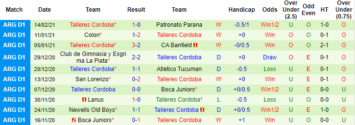+ Thống kê 10 trận gần nhất của Talleres Cordoba
