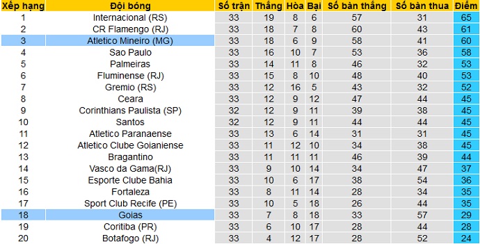 Trái lại Atlético Mineiro đang đứng thứ ba trên bảng xếp hạng với 60 điểm sau 33 vòng đấu. Hiện tại Atlético Mineiro chỉ còn kém đội nhì bảng Flamengo 1 điểm và kém đội đầu bảng Internacional 5 điểm trong khi giải còn 5 vòng đấu nữa.
