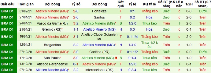 + Thống kê 10 trận gần nhất của Atlético Mineiro