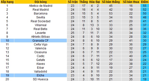 Bảng xếp hạng La Liga trước vòng 25