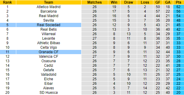 Granada đang có phong độ rất cao trên sân nhà. 3 lần tiếp khách gần đây tại La Liga họ toàn thắng, ghi 6 bàn và chỉ 1 lần để thủng lưới. Xa hơn, 11 trận sân nhà trước đó Granada bất bại 9 lần với 6 chiến thắng và 3 trận hòa. Tuy nhiên ở trận đấu sắp tới Granada lại không được tin tưởng vào khả năng có điểm trước đối thủ Sociedad.