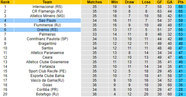 Nhưng Sao Paulo vẫn cần nỗ lực để giữ vững vị trí trong top 4 để có suất dự Copa Libertadores. Dẫu thế thì làm khách trên sân của Gremio là điều không dễ dàng với Sao Paulo. Gremio đang đứng thứ 6 và chỉ kém Sao Paulo có 3 điểm. Cơ hội cho Gremio vươn lên top 4 vẫn rộng mở, và họ sẽ san bằng điểm số với Sao Paulo nếu như thắng trận này.