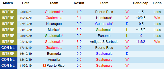 Tranh thủ quãng thời gian các giải trong nước tạm nghỉ ít ngay, Guatemala vs Puerto Rico có 2 trận giao hữu. Ở cuộc chiến cách đây 3 ngày, Guatemala đã giành chiến thắng với tỷ số tối thiểu, và điều đó không khiến ai bất ngờ bởi Guatemala được đánh giá cao hơn so với đối thủ.