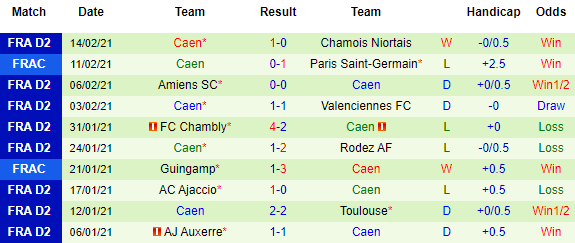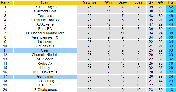 Phía đối diện, Caen đang ở khu vực giữa BXH với điểm số an toàn. Tuy vậy thì Caen gần như không có cửa vươn lên nhóm cạnh tranh vé thăng hạng. Họ kém vị trí được đá play-off gần nhất tới 11 điểm, con số gần như không thể san lấp bởi Ligue 2 có độ phân cấp thấp.