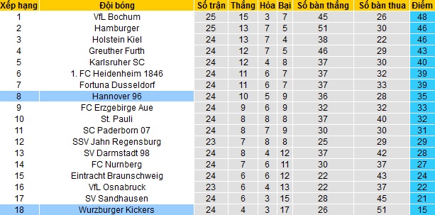 Sau 24 vòng đấu tại giải hạng nhì Đức, Hannover đang có được 35 điểm và đang tạm đứng thứ 8 trên bảng xếp hạng. Thế nhưng khoảng cách với nhóm các đội Top 3 hiện đã là 11 điểm trong khi giải vẫn đang còn 10 vòng đấu nữa.