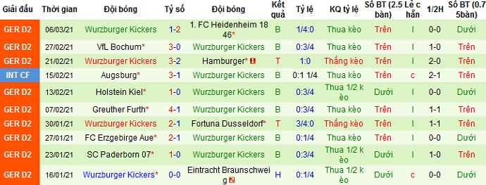 Trong 5 trận đấu gần đây Würzburger Kickers chỉ có được trận thắng đầy bất ngờ trước Hamburger, để thua ở cả 4 trận còn lại. Thành tích sân khách của đội bóng còn tệ hơn rất nhiều khi để thua tới 11 trong 12 trận kể từ đầu mùa giải, trong đó đang thua ở cả 6 trận gần nhất.