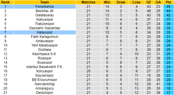 Ở thời điểm hiện tại, Hatayspor đang đứng thứ 7 trong khi Fenerbahce dẫn đầu giải đấu. Với Fenerbahce thì vị trí đó không quá bất ngờ, nhưng với Hatayspor thì đó là nỗ lực đáng khen. Hatayspor đang tạo ra khoảng cách an toàn với nhóm cầm đèn đỏ, thậm chí họ còn nguyên hy vọng giành vé dự Cúp châu Âu.