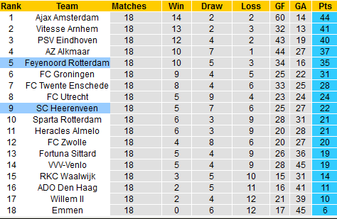 Tuy nhiên, Heerenveen đã dần trở về mặt đất với phong độ đáng lo ngại như mùa trước. Trong 12 trận gần nhất ở mọi giải đấu, Heerenveen chỉ có duy nhất 1 lần giành chiến thắng tại Cúp QG trước Emmen thuộc diện đàn em, còn lại chỉ biết đến hòa và thua.
